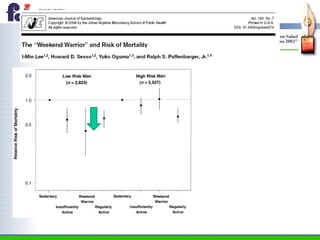 El documento describe los beneficios del ejercicio físico para la salud. Explica que el ejercicio mejora la condición física en áreas como la fuerza muscular, resistencia cardiovascular, composición corporal y metabolismo. También discute cómo el sedentarismo es un factor de riesgo para enfermedades como la obesidad, diabetes y enfermedades cardiovasculares, mientras que el ejercicio regular reduce dichos riesgos. Finalmente, enfatiza la importancia de adoptar un estilo de vida activo para mantener una buena salud.