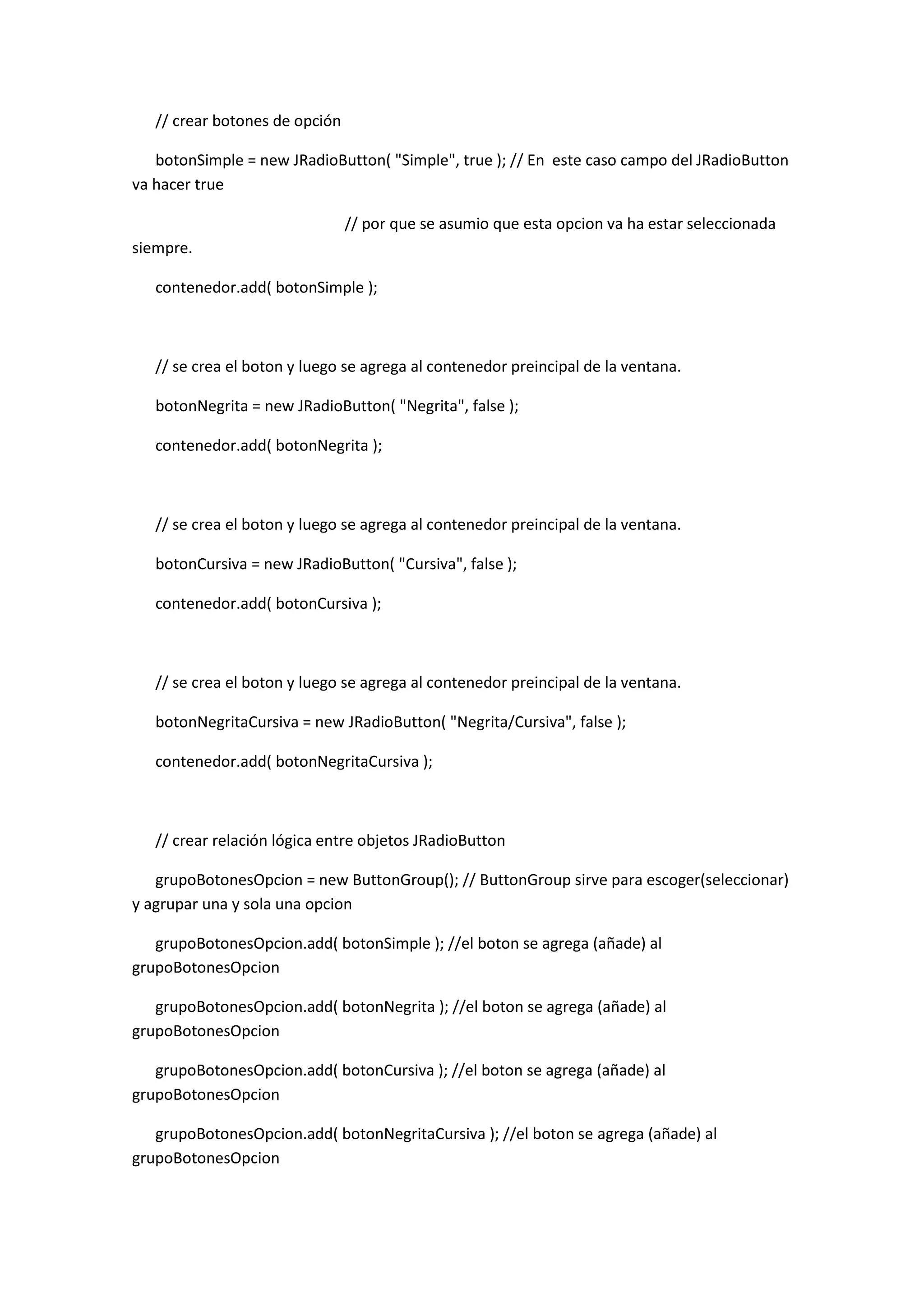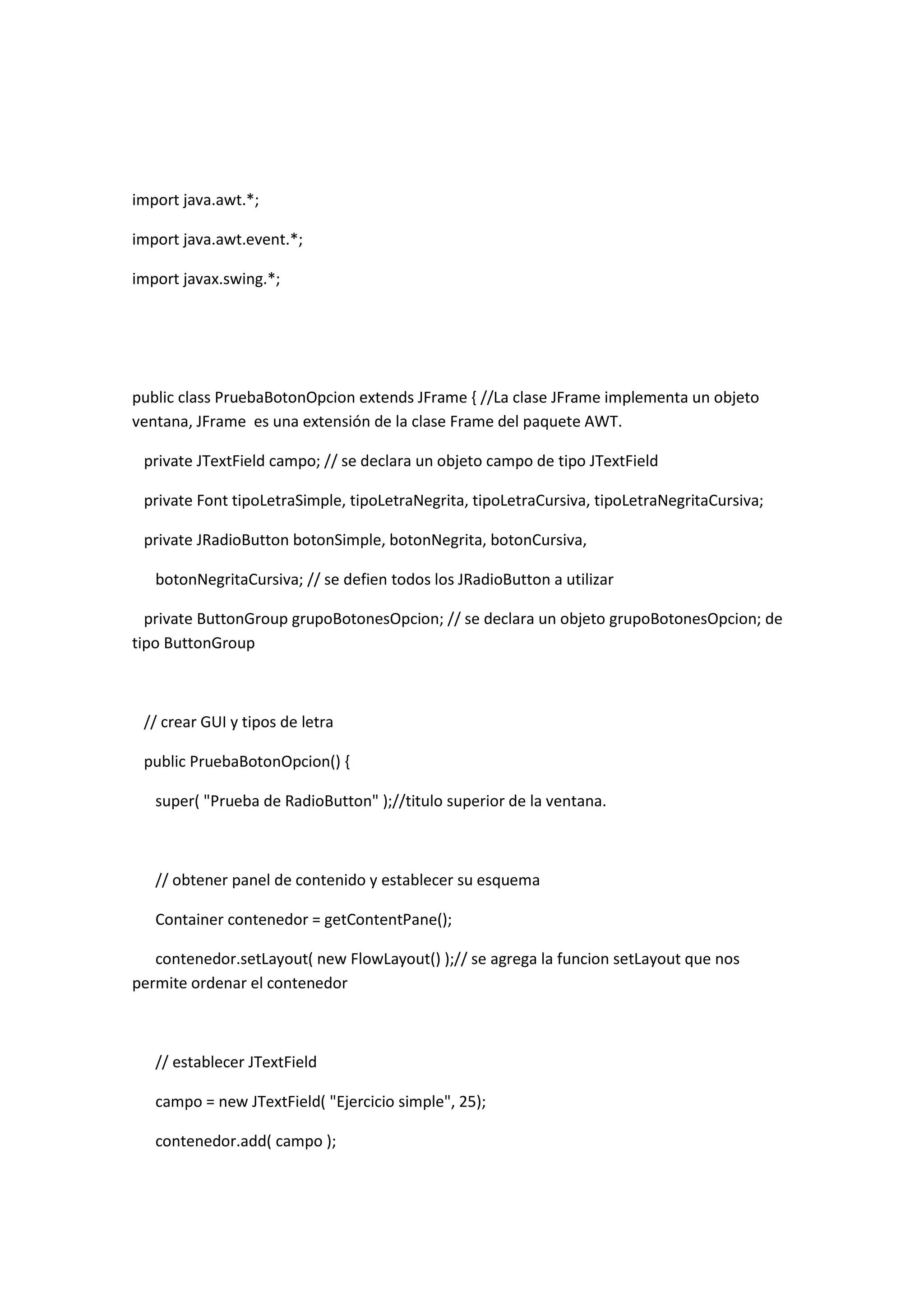 Este código Java crea una ventana con un campo de texto y cuatro botones de opción para cambiar el estilo de letra del texto entre simple, negrita, cursiva y negrita/cursiva. Al seleccionar un botón, se actualiza el estilo de letra del campo de texto usando objetos Font creados para cada estilo. Los botones de opción están agrupados lógicamente para permitir seleccionar solo un estilo a la vez.
