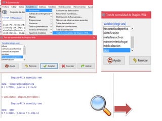 Este documento resume los pasos para calcular la correlación entre dos variables cuantitativas. Primero, se eligen las variables peso y horas de práctica deportiva. Luego, se usa la prueba de Shapiro-Wilk para determinar que ninguna variable sigue una distribución normal, por lo que se utiliza el coeficiente de Spearman. Los resultados muestran una correlación débil pero existente entre peso y horas de práctica deportiva.