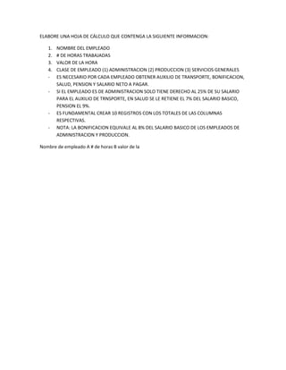 El documento instruye crear una hoja de cálculo con información de empleados incluyendo nombre, horas trabajadas, valor por hora y clase de empleado. Se debe calcular el auxilio de transporte, bonificación, salud, pensión y salario neto para cada empleado y crear 10 registros con totales de columnas. Los empleados de administración tienen derecho al 25% de su salario en transporte, 7% en salud y 9% en pensión, mientras la bonificación es el 8% del salario básico para administración y producción.