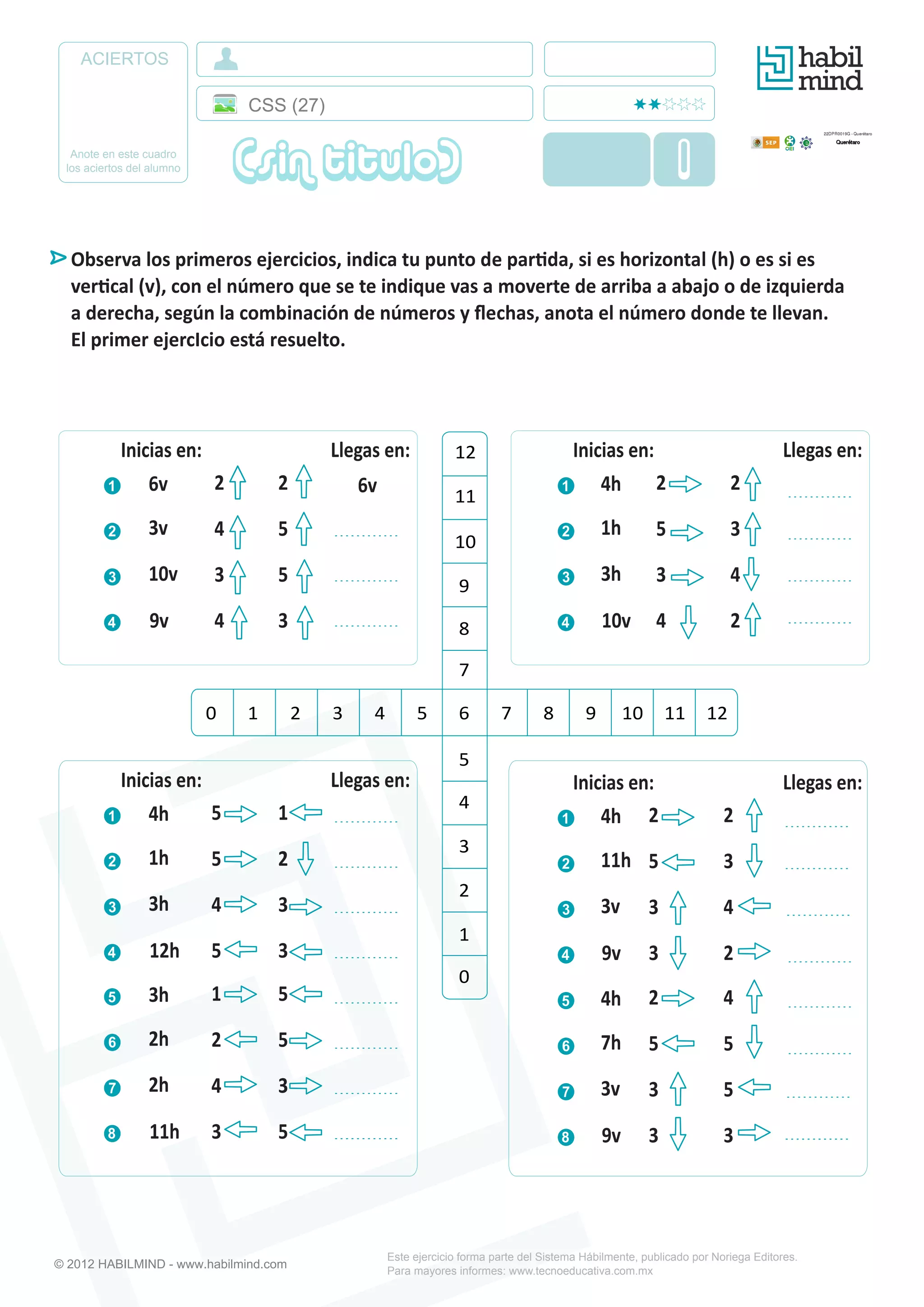 Este documento presenta una serie de ejercicios de movimiento en una cuadrícula numérica. Los ejercicios involucran moverse horizontal o verticalmente según las instrucciones de números y flechas para llegar a un número objetivo. El primer ejercicio está resuelto como ejemplo.
