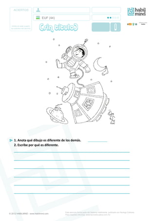 Este documento presenta un ejercicio de un sistema educativo para evaluar las habilidades de los estudiantes. El ejercicio pide al estudiante que identifique qué dibujo es diferente de los demás y explique por qué es diferente. No se proporciona la solución al ejercicio. El documento también incluye información sobre el sistema educativo del que forma parte el ejercicio.