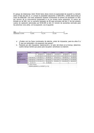 El parque temático Astro World considera expandirse comprando una propiedad adyacente por $250,000 e invirtiendo $550,000 en nuevas atracciones. Esto se espera que aumente la asistencia un 30% más allá de las proyecciones sin expansión. Los costos operativos adicionales serían de $100,000 anualmente. Para recuperar la inversión inicial de $800,000, se necesitarían aproximadamente 3 años considerando los mayores ingresos proyectados debido al aumento de asistencia.