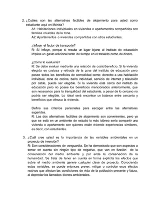 Este documento presenta varios ejercicios propuestos sobre la formulación de proyectos. El primer ejercicio describe el caso de un dueño de un carro por puesto que ha perdido días de trabajo debido a fallas mecánicas y propone dos alternativas: cambiar de mecánico o vender el por puesto actual por uno más sencillo. El segundo ejercicio pregunta sobre alternativas de alojamiento para un estudiante en Mérida. El tercer ejercicio discute la importancia de las variables ambientales en proyectos de inversión. El cuart