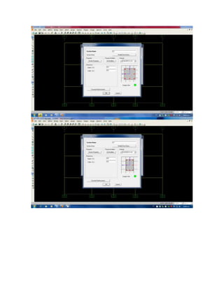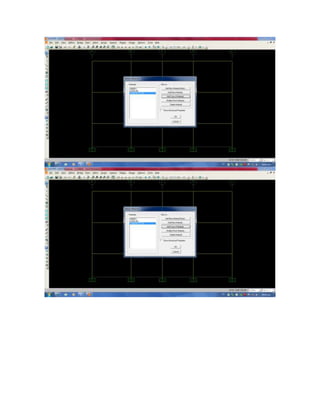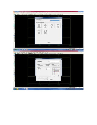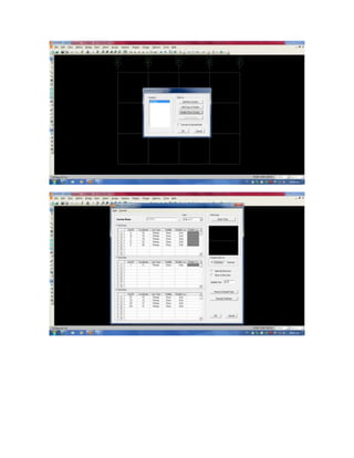 El documento proporciona instrucciones paso a paso para crear un modelo de una armadura en un programa de ingeniería civil. Primero se define el número de líneas que cortan el eje X, Y y Z y las distancias entre puntos. Luego se dibuja la armadura y se definen los puntos de empotramiento. Finalmente, se especifican las secciones transversales de las columnas y vigas y se asignan los materiales con sus propiedades.