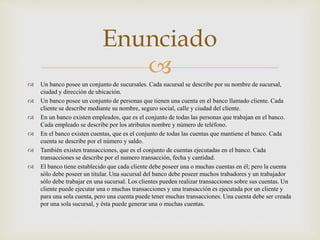 El documento describe las entidades y relaciones clave de un banco. Las entidades son sucursales, clientes, empleados, cuentas y transacciones. Cada entidad tiene atributos únicos. Las relaciones son que los clientes tienen una o más cuentas, las cuentas pertenecen a un solo cliente, las sucursales tienen muchos empleados, los empleados trabajan en una sola sucursal, los clientes pueden realizar transacciones en sus cuentas y las cuentas pueden tener múltiples transacciones.