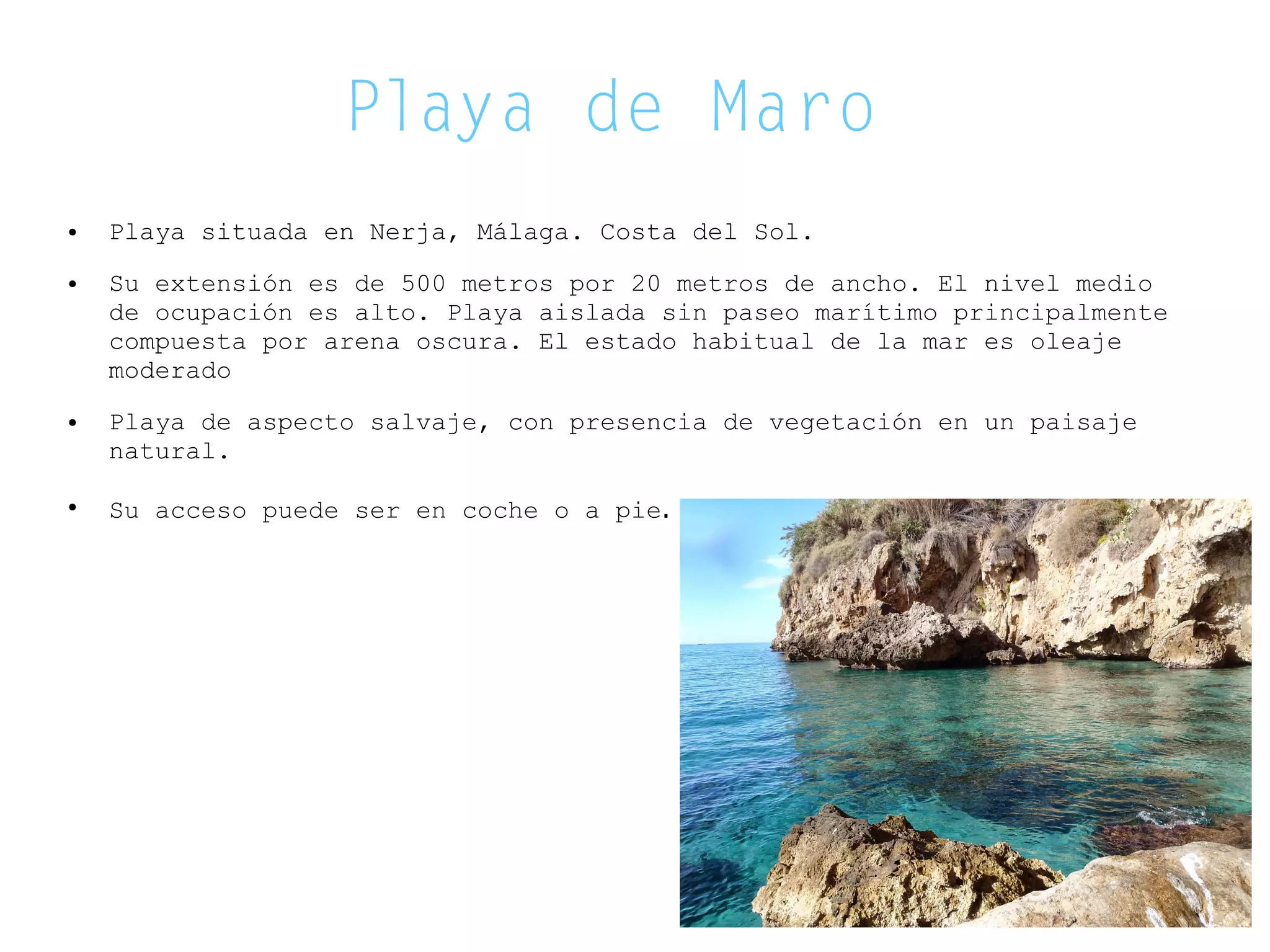 El documento describe cuatro playas españolas: Playa de Maro en Nerja, Playa de Burriana también en Nerja, Playa de la Malagueta en Málaga y Playa de la Torrecilla en Nerja. Se proporciona información sobre la ubicación, tamaño, accesibilidad, nivel de ocupación y características de cada playa.
