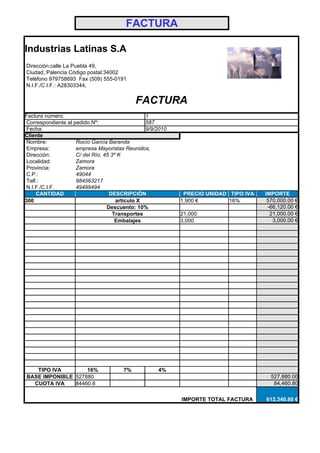 La factura resume la venta de 300 unidades de un artículo a una empresa mayorista. Detalla la descripción del artículo, el precio unitario, los descuentos, y otros cargos por transporte y embalaje. Además, especifica los detalles de impuestos aplicables y el importe total de la factura.