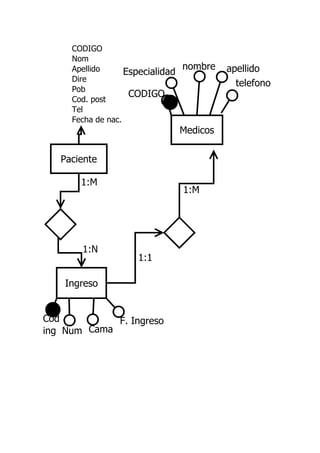Este documento contiene información sobre médicos y pacientes, incluyendo sus códigos, nombres, apellidos, especialidad, dirección, teléfono, fecha de nacimiento y detalles de ingresos como fecha, número y cama.