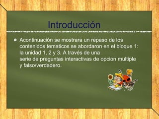 Este documento presenta un repaso de los contenidos temáticos abordados en el bloque 1 de español de 2do grado a través de preguntas interactivas sobre conceptos como proyectos, resúmenes, tiempos verbales, cartelería y cuentos. El estudiante debe elegir respuestas correctas y determinar si otras son falsas u verdaderas.