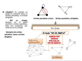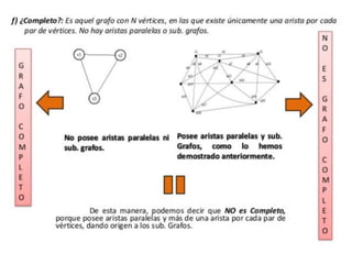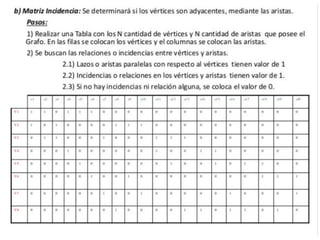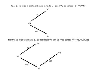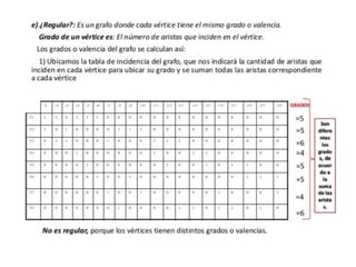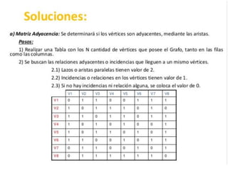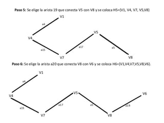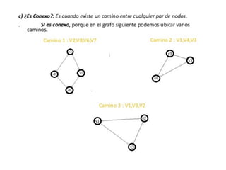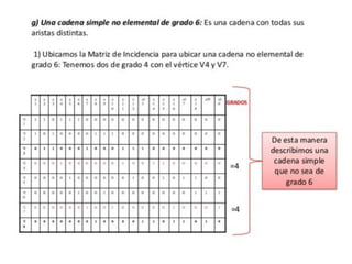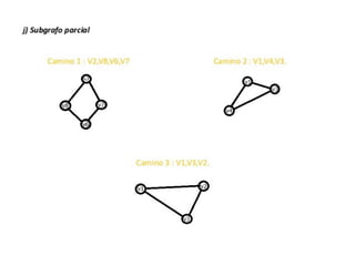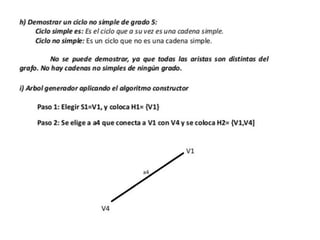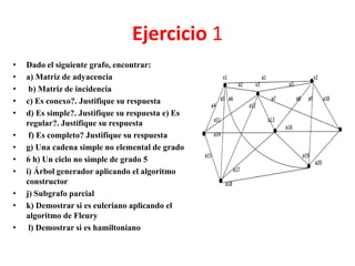 El documento presenta un ejercicio sobre grafos que incluye encontrar la matriz de adyacencia y de incidencia de un grafo, determinar si es conexo, simple, regular, completo, euleriano o hamiltoniano, encontrar una cadena y un ciclo, construir un árbol generador y un subgrafo parcial, y calcular distancias utilizando el algoritmo de Dijkstra. Se proveen detalles sobre cómo aplicar los algoritmos de Fleury y Dijkstra al grafo dado para resolver las preguntas planteadas.