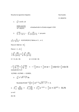 1) La integral de 3x de 0 a 1 es igual a 0.54. 2) La integral de (x+1)/(x-3) de 0 a 2 es igual a -0.54931. 3) La integral de √(4-x^2) de 0 a 1 es igual a π/4.