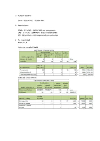 Electronic Comunications fabrica radios portátiles para comunicaciones de dos vías y desea establecer una estrategia de distribución que maximice las ganancias totales. La estrategia asignará unidades a distribuidores marinos, de oficinas, cadenas nacionales de tiendas y pedidos por correo, sujeto a restricciones de presupuesto publicitario, horas de ventas y unidades mínimas para cadenas nacionales.