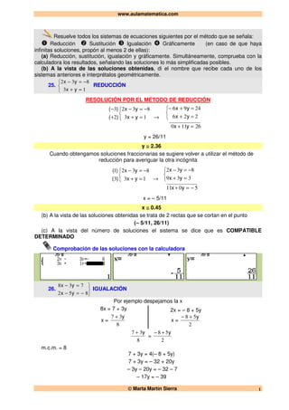 Este documento presenta la resolución de varios sistemas de ecuaciones por diferentes métodos como reducción, sustitución, igualación y gráficamente. Explica cada método con ejemplos numéricos y da las soluciones de cada sistema, indicando si son compatibles determinados, incompatibles o tienen infinitas soluciones.