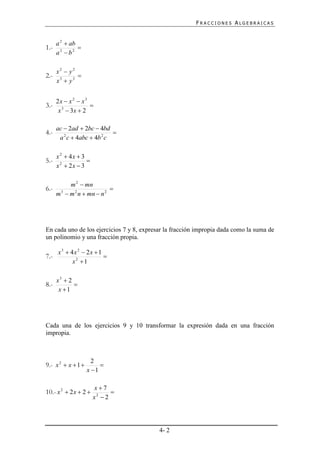 Este documento presenta una serie de ejercicios sobre operaciones con fracciones algebraicas, incluyendo multiplicar, dividir, sumar y simplificar fracciones. Los ejercicios cubren temas como multiplicar términos fraccionarios, expresar fracciones impropias y propia, y realizar operaciones algebraicas complejas con fracciones.