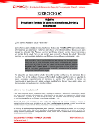 El documento aborda la práctica de formato de párrafo, bordes y sombreados en un contexto educativo, mencionando la importancia de frases de salud y bienestar que fomentan una vida saludable. Destaca que estas frases pueden provenir de diversos profesionales de la salud y sugiere consultar a un médico para aclarar dudas. Además, incluye ejercicios prácticos para mejorar habilidades informáticas, como el uso de tabulaciones y la implementación de diferentes estilos de texto.