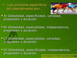 Este documento contiene 40 preguntas de tipo test sobre diversos temas relacionados con la educación física como el calentamiento, acrosport, resistencia, baloncesto, balonmano, malabares y escalada. Se proporcionan 4 opciones de respuesta para cada pregunta y se indica que cada 3 respuestas erróneas se resta 1 acierto.