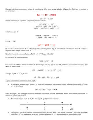1) El documento presenta información sobre cálculos de pH en soluciones acuosas, incluyendo definiciones de ácidos y bases, el pH de ácidos y bases fuertes y débiles, y ejemplos de cálculos. 2) Explica que el pH es el logaritmo negativo de la concentración de iones hidrógeno y cómo calcular el pH para ácidos y bases fuertes y débiles usando ecuaciones de equilibrio químico. 3) Proporciona una tabla con ejemplos de valores de pH comunes para varias sust