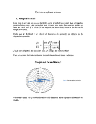 Este documento describe diferentes tipos de arreglos de antenas, incluyendo arreglos broadside, patrones de radiación para arreglos de 8 elementos, y cómo calcular el campo total y la directividad para arreglos específicos. Explica que un arreglo broadside tiene todas las corrientes en fase y la distancia entre antenas es media longitud de onda, y que un arreglo de 8 elementos tendrá un patrón de radiación variando cada 10 grados. También cubre cómo calcular el campo total para un arreglo de dos dipolos separados media longitud de on