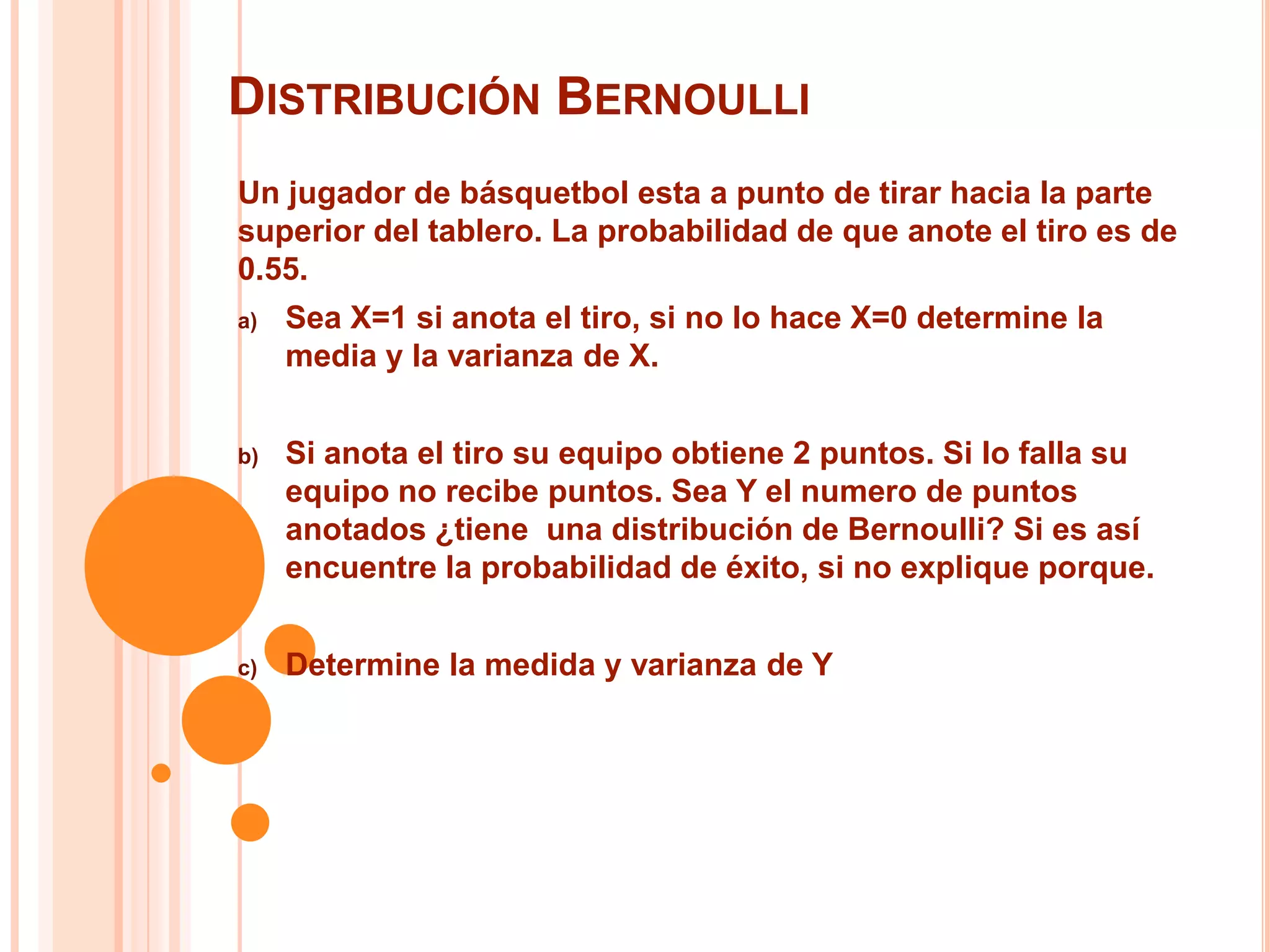 El documento presenta varios problemas estadísticos relacionados con distribuciones de probabilidad. En el primer problema, se calculan la media y varianza de una variable aleatoria con distribución de Bernoulli. En el segundo problema, se calculan la media y varianza de una variable aleatoria con distribución binomial. En el tercer problema, se calculan probabilidades para una variable aleatoria con distribución de Poisson.