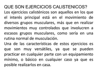 Los ejercicios calisténicos se centran en el movimiento de diversos grupos musculares y son versátiles, pudiendo realizarse casi en cualquier lugar con poco o ningún equipamiento. Ejemplos incluyen sentadillas, fondos, dominadas y flexiones, cada uno enfocado en diferentes grupos musculares. Esta modalidad de ejercicio es especialmente accesible para quienes desean entrenar en casa.