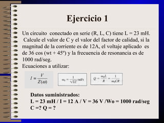 El documento presenta la resolución de tres ejercicios relacionados con circuitos resonantes. El primer ejercicio involucra un circuito RLC en serie y solicita calcular el valor de C y el factor de calidad Q. El segundo ejercicio trata sobre un circuito resonante en paralelo, donde se piden los parámetros C, L, Q, W1 y W2. El tercer ejercicio también involucra un circuito resonante en paralelo y solicita calcular varios parámetros incluyendo W0, W1, W2 y Q.