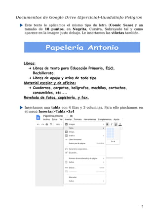 Este documento proporciona instrucciones paso a paso para crear una tabla en Google Docs con información sobre una papelería. Incluye cómo insertar un cuadro de texto, agregar texto con formato específico, insertar imágenes en una tabla de 4 filas y 3 columnas, y rellenar celdas y bordes de la tabla.