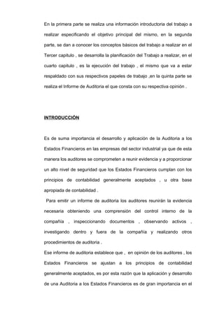 El documento presenta un resumen de tres partes de una tesis sobre la aplicación de una auditoría a los estados financieros de una empresa industrial. En la primera parte, introduce el objetivo de determinar si los estados financieros se prepararon de acuerdo con los principios de contabilidad aceptados. Luego describe el proceso de investigación de la auditoría. En la segunda parte, presenta conceptos clave como la definición de auditoría financiera y las fases del proceso de auditoría. En la tercera parte, detalla las etapas de planificación, ejecución e in