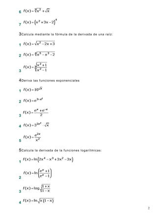 Este documento presenta una serie de ejercicios para calcular derivadas de diferentes tipos de funciones, incluyendo potencias, raíces, exponenciales, logarítmicas, trigonométricas, inversas trigonométricas, funciones en cadena y derivadas implícitas. Proporciona las fórmulas necesarias y guía los pasos para derivar cada tipo de función.