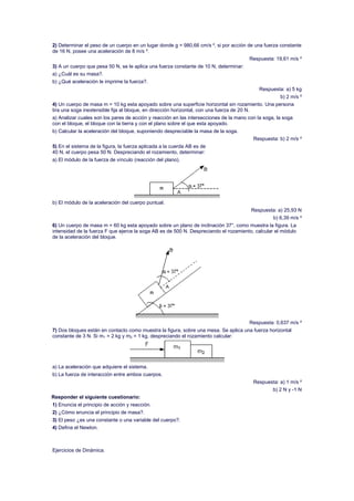 El documento presenta una serie de 10 problemas de dinámica para resolver. Los problemas involucran conceptos como fuerza, masa, aceleración, peso, gravedad y rozamiento. Se piden cálculos como determinar masas, fuerzas, aceleraciones y distancias basados en datos numéricos provistos sobre sistemas mecánicos en movimiento o en reposo. Adicionalmente, se incluyen dos cuestionarios relacionados con principios de dinámica y rozamiento.