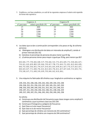 Este documento presenta 7 ejercicios estadísticos que involucran el cálculo y representación gráfica de distribuciones de frecuencia a partir de conjuntos de datos. Los ejercicios cubren temas como intervalos de clase, frecuencias absolutas y relativas, diagramas de barras, polígonos de frecuencia, medidas de tendencia central y dispersión.