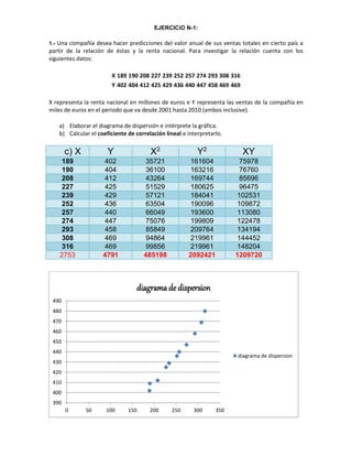 El documento presenta los resultados de tres ejercicios estadísticos realizados por un estudiante. El primer ejercicio analiza la relación entre la renta nacional y las ventas de una compañía a través de un diagrama de dispersión y el cálculo del coeficiente de correlación. El segundo ejercicio calcula la correlación entre años de experiencia y número de infracciones de conductores. El tercer ejercicio grafica la relación entre el tamaño de tiendas y sus ingresos y calcula su coeficiente de correlación.