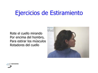 Este documento describe una serie de ejercicios de estiramiento para diferentes partes del cuerpo, incluyendo el cuello, hombros, brazos, espalda, caderas, piernas y torso. Los ejercicios implican llevar diferentes partes del cuerpo en posiciones que estiran los músculos a través de movimientos suaves y controlados.