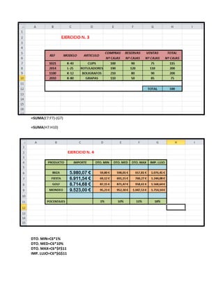 Este documento contiene varias fórmulas de Excel para realizar cálculos comunes como sumas, promedios, condicionales e impuestos. Algunas de las fórmulas incluyen sumar celdas, calcular promedios, determinar si un valor está aprobado o reprobado, calcular descuentos e impuestos sobre ventas, sumar sueldos y calcular descuentos por concepto de seguridad social.
