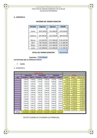 Este documento presenta 9 ejercicios de Excel para practicar diferentes fórmulas. Los ejercicios incluyen el uso de fórmulas como suma, promedio, máximo, mínimo, porcentaje e if/si para calcular ventas, inventario, descuentos, saldos e informes financieros. El objetivo es que los estudiantes practiquen el uso de fórmulas comunes de Excel para realizar cálculos y análisis de datos.