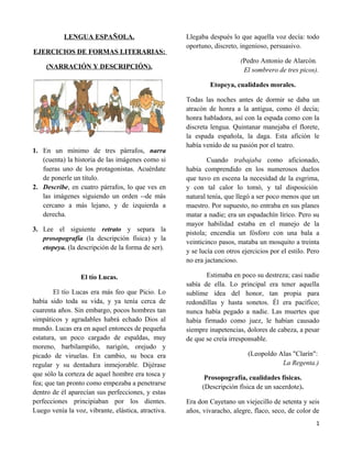 El documento presenta una serie de ejercicios de formas literarias como la narración, descripción, retrato y otros. Incluye extractos literarios de autores como Pedro Antonio de Alarcón y Leopoldo Alas "Clarín" para que sirvan de modelo o inspiración para realizar los ejercicios propuestos.