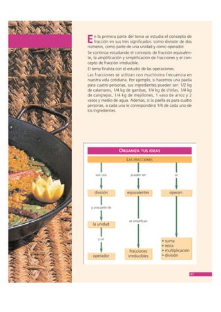 El documento habla sobre las fracciones. Explica que una fracción puede representar una división, una parte de una unidad o un operador. También cubre conceptos como fracciones equivalentes, simplificación y reducción de fracciones a un denominador común, y las operaciones básicas de suma y resta con fracciones.