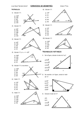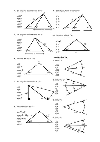 Este documento contiene 10 ejercicios de geometría sobre triángulos, triángulos notables y congruencia para el grado 3o de secundaria. Los ejercicios consisten en calcular ángulos desconocidos, lados desconocidos y valores expresados en función de los elementos del triángulo.