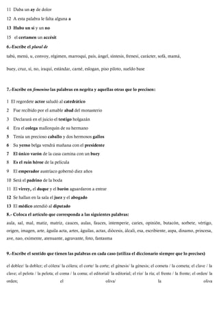 Este documento contiene varios ejercicios gramaticales sobre diferentes temas como nombres colectivos, nombres abstractos, plurales, género, artículos, adjetivos, determinantes y pronombres. El documento proporciona instrucciones para identificar y corregir errores en el uso de estas categorías gramaticales a través de oraciones, textos y ejemplos.