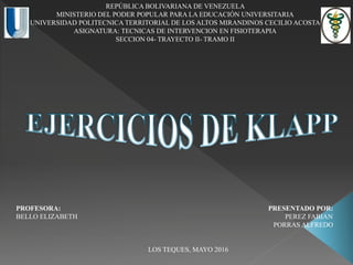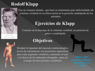Este documento resume el método de Klapp, un tratamiento desarrollado por el cirujano alemán Rodolf Klapp para deformidades de columna vertebral. Consiste en ejercicios de gateo o en cuatro patas que descargan la columna y estiran los músculos contracturados para corregir desviaciones. Se describen varias posiciones para aplicar el método a diferentes segmentos vertebrales y ejercicios complementarios como deambulación y estiramientos.