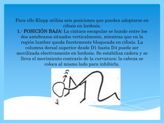 Este documento describe 17 ejercicios de Klapp y McKenzie para tratar la columna vertebral. Los ejercicios de Klapp involucran 6 posiciones que permiten movilizar la columna en diferentes planos, mientras que los ejercicios de McKenzie se basan en la flexión y extensión de la columna. Ambos conjuntos de ejercicios tienen como objetivo tratar problemas de espalda mediante el movimiento controlado y progresivo de la columna vertebral.