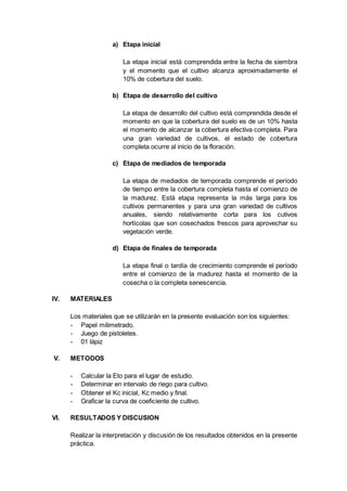 Este documento describe los conceptos básicos relacionados con los parámetros meteorológicos para determinar los requerimientos hídricos de los cultivos, incluyendo el coeficiente de cultivo (Kc) y las etapas de crecimiento de los cultivos. Explica que el Kc expresa la relación entre la evapotranspiración del cultivo y la de referencia, y varía según la cobertura y desarrollo del cultivo. Además, divide el ciclo de crecimiento en 4 etapas: inicial, desarrollo, mediados de