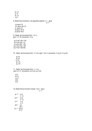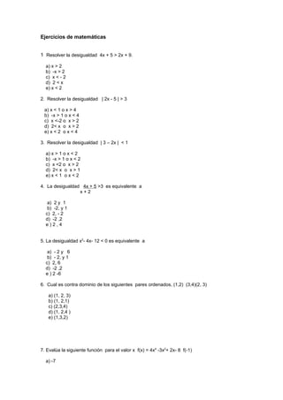 Este documento contiene 36 problemas de matemáticas que involucran álgebra, ecuaciones, desigualdades, funciones, porcentajes y geometría. Los problemas van desde resolver ecuaciones y desigualdades hasta calcular porcentajes de aumento o descuento, determinar coordenadas de vértice de funciones cuadráticas y factorizar polinomios. El documento provee una variedad de ejercicios matemáticos para practicar diferentes temas y conceptos.