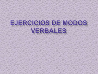El documento describe los diferentes modos verbales en español, incluyendo el modo indicativo, modo subjuntivo e imperativo. Explica que cada modo verbal tiene formas específicas de conjugación y tiempos verbales asociados. Luego proporciona ejemplos de uso del pretérito perfecto y pretérito imperfecto. Finalmente, pide identificar el modo verbal de varias oraciones de ejemplo.