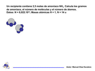 Un recipiente contiene 2,5 moles de amoniaco NH3. Se calculan los gramos de amoniaco (42,5 gramos), el número de moléculas (1,5 x 1024 moléculas) y el número de átomos (6 x 1024 átomos) mediante la conversión de moles a gramos, la multiplicación del número de moles por el número de Avogadro y la multiplicación del número de moléculas por el número de átomos por molécula.