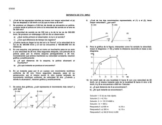 Este documento presenta 10 preguntas sobre conceptos de velocidad, incluyendo: 1) cuál móvil se mueve más rápido entre opciones dadas, 2) calcular el tiempo que tarda el sonido en llegar a un policía después de un disparo, y 3) determinar cuándo y dónde dos vehículos se encontrarán si uno persigue al otro a diferentes velocidades constantes. También incluye gráficos y ejercicios para analizar y representar variaciones en la velocidad de objetos en movimiento rectilíneo uniforme.
