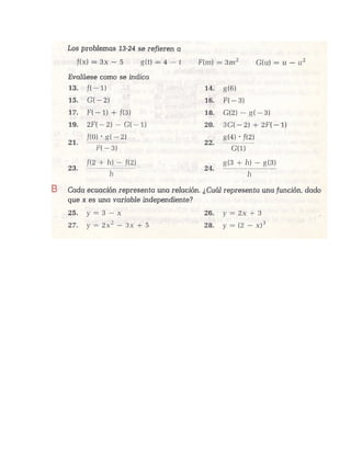 Este documento presenta una serie de ejercicios prácticos relacionados con funciones lineales. Incluye emparejar gráficas con ecuaciones, graficar ecuaciones, determinar dominios y campos de valores, evaluar funciones, identificar si puntos son soluciones de ecuaciones, y hallar pendientes e interceptos. El documento fue preparado por la profesora Carmen Batiz para su clase de funciones lineales.