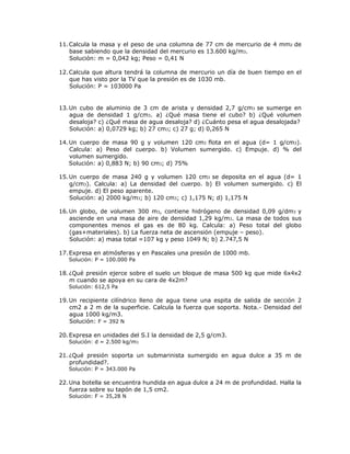 1. El documento presenta una serie de problemas de mecánica de fluidos relacionados con presiones, fuerzas y empujes ejercidos por fluidos. Los problemas incluyen cálculos de presiones en diferentes unidades, fuerzas sobre superficies sumergidas, factores de amplificación en prensas hidráulicas y cálculos relacionados con objetos que flotan.