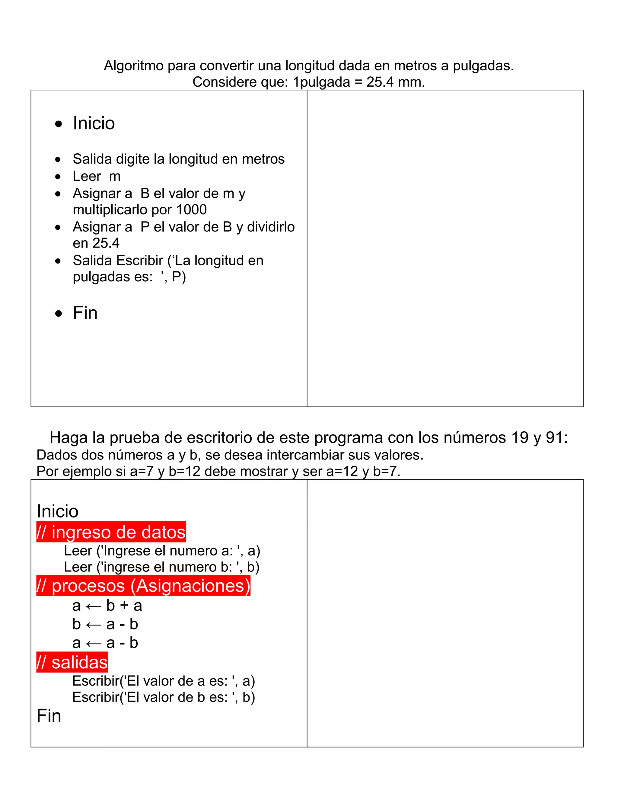 Este documento presenta tres algoritmos y programas. El primero convierte una longitud dada en metros a pulgadas. El segundo intercambia los valores de dos variables a y b. El tercero calcula la velocidad de un automóvil en km/h a partir del tiempo en minutos, segundos y centésimas y la distancia recorrida en metros.
