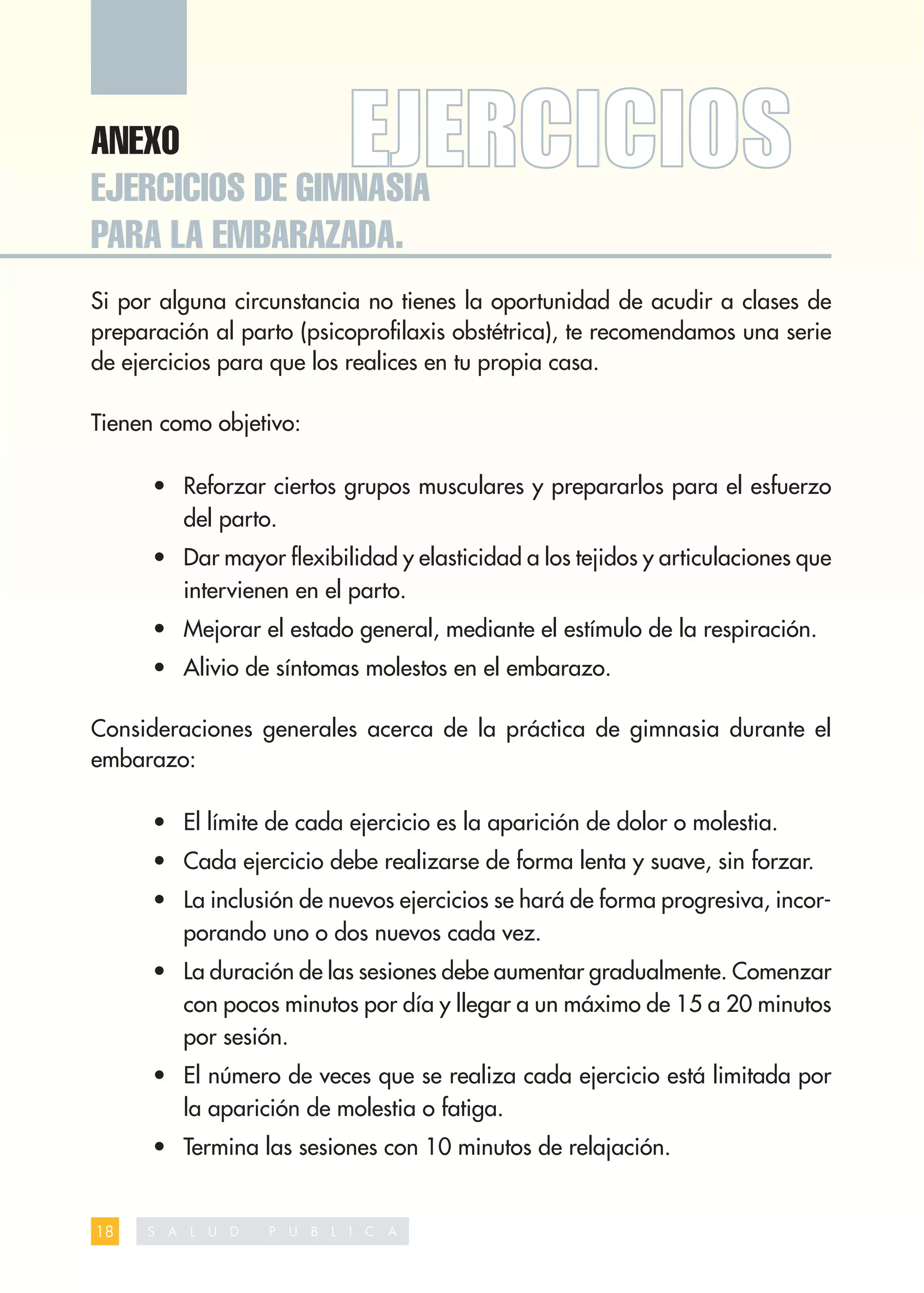 El documento presenta una serie de ejercicios de gimnasia para realizar durante el embarazo con el objetivo de fortalecer los músculos necesarios para el parto y mejorar la flexibilidad. Incluye ejercicios posturales, circulatorios, para los músculos del pecho, la pelvis y las piernas. Recomienda realizar los ejercicios de forma suave y progresiva, aumentando gradualmente la duración y disminuyendo si se siente dolor.